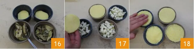 Grease the bottom of the terrine 13 and using a pastry cutter, cut out 4 discs of 2.75 inches 14 and 4 of 3.15 inches. Assemble the terrines by placing the smaller disc at the bottom 15,