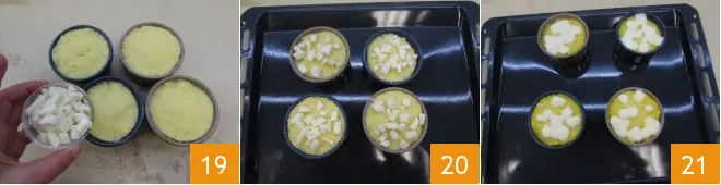 Finish the terrines 19 with the remaining scamorza cheese and gratinate for about 10 minutes in a static oven at 392°F 20 (if using a convection oven, bake for about 6 minutes at 356°F). Remove from the oven 21 and serve the polenta and porcini mushroom terrines while hot.