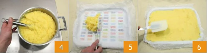 Continue by stirring the polenta with a spatula 4 or a wooden spoon to mix it well. When the polenta is ready, pour it onto a tray lined with parchment paper 5, and level the surface 6. You need to achieve a thickness of about 0.4 inches, then let it rest at room temperature.