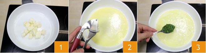 To prepare the gratinated scallops with butter and brandy, place the butter cut into pieces in a pan, where it will be melted over low heat for a few minutes 1; then add a crushed garlic clove 2, let it brown (still over low heat), add the chopped parsley and remove the pan from the heat 3.