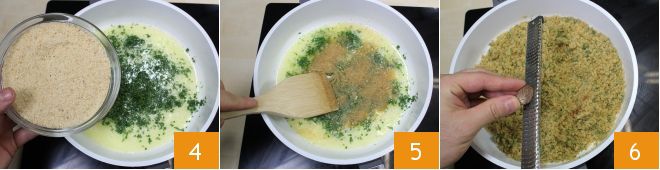 Add the breadcrumbs a little at a time 4, continuing to stir 5, until you obtain a homogeneous mixture; adjust with salt and pepper, then flavor everything by grating nutmeg into it 6.