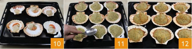 Take the cleaned scallops and place them in the shells 10, which you have previously put on a baking tray. Add one and a half tablespoons of the breadcrumb and brandy mixture to each shell, leveling the surface with the back of a spoon 11, then cook everything in a preheated static oven at 430°F for 5 minutes. After this time, place the scallops under the grill for another 5 minutes: they should be golden 12. The gratinated scallops with butter and brandy are ready, serve them still hot!