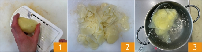 To prepare the gratinated sea bass fillets, first put a pot of slightly salted water on the stove. Meanwhile, peel the potatoes and slice them with a mandoline 1: you should get very thin slices 2. Blanch the potato slices for 5 minutes 3, then drain and set aside.
