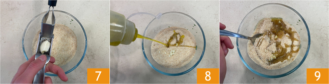 Add the crushed garlic clove 7, grated lemon zest, and oil 8. Mix the mixture well 9.