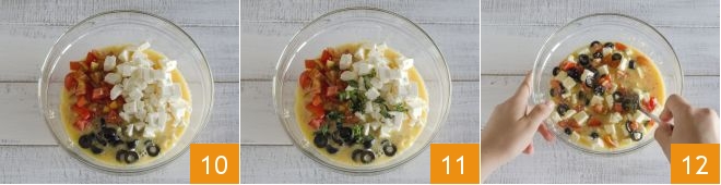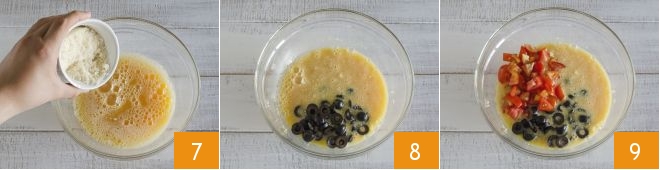 Take the egg mixture and add the grated Grana Padano DOP 7, the black olives 8, the cherry tomatoes 9,