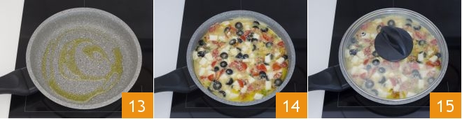 After this time, flip the omelette with the help of a flat plate 16, slide it back into the pan 17 and continue cooking for about 5 minutes, always with the lid on. When the other side is cooked, your Greek omelette is ready to be served 18!