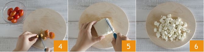 and cut the cherry tomatoes into small pieces 4, then cut the feta into cubes (5-6).