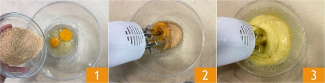 To prepare the Greek yogurt tiramisu, start with the sponge cake: in a bowl, add the sugar and eggs 1, then mix with electric whisks for about ten minutes 2 until the mixture is light and frothy 3.