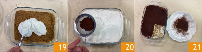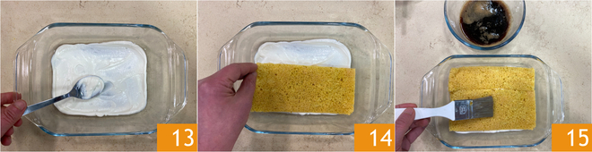 Spread about half of the Greek yogurt cream on top 16 and proceed with another layer of sponge cake 17 to be soaked with coffee 18.