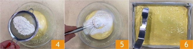 Sift the flour 4 and gently fold it in with a spatula 5. Transfer the mixture to a 13.5x11 inches (35x28 cm) baking sheet lined with parchment paper and level it carefully 6.