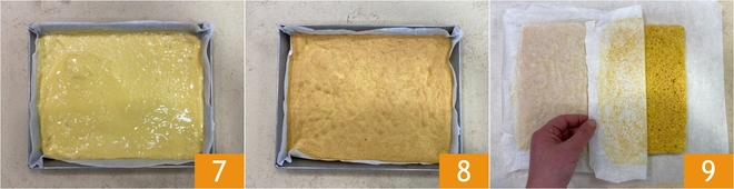 Bake the sponge cake in a preheated static oven at 350°F (180°C) for about 15 minutes 7. When it's cooked 8, flip it onto a sheet of parchment paper and let it cool completely. Once cooled, gently remove the top parchment paper 9.