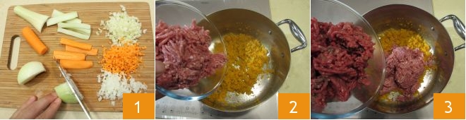 To prepare green lasagna with Ragu' alla bolognese, start by preparing the sauce, which requires long cooking times. Finely chop the onion, carrot, and celery using a knife or mixer 1. Heat the oil in a saucepan and add the chopped vegetables. Let them sauté over low heat for at least 20 minutes, then add the minced fresh pork pancetta 2 and minced beef 3.