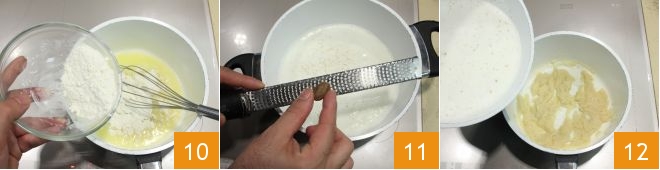 Proceed to prepare the Béchamel sauce: heat the milk in a saucepan. Meanwhile, in another pan, melt the butter over low heat and, once melted, remove from heat and add the sifted flour 10. Stir vigorously with a whisk to obtain a lump-free mixture (roux) until the flour is golden. Then return the pan to the heat until it turns golden. When the milk is hot, flavor it with grated nutmeg and a pinch of salt 11. At this point, you can add it to the butter and flour mixture 12. Stir vigorously with a whisk and let it thicken over low heat: the mixture should be smooth and free of lumps. Cook the bechamel for about 5-6 minutes over low heat until it becomes creamy.