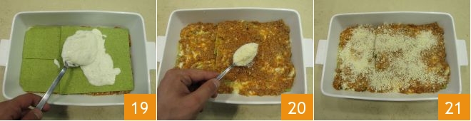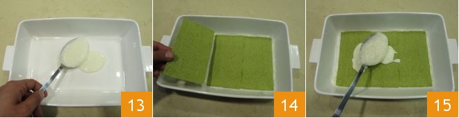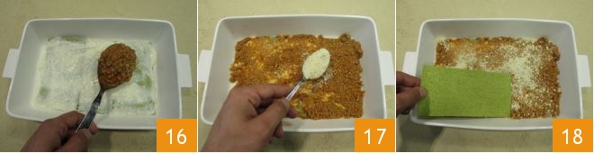 Then move on to assembling the lasagna: take a rectangular baking dish measuring 12 inches long and 8 inches wide. Spread a thin layer of bechamel evenly over the entire surface of the baking dish 13, then lay down the green lasagna sheets 14 and pour a thin layer of bechamel 15.