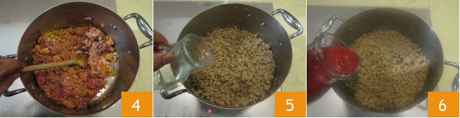 Let it brown, stirring with a wooden spoon 4 to ensure even cooking and to prevent it from sticking to the bottom of the pan. Once the meat is browned and dry, add the white wine 5 and let it evaporate completely. Then add the tomato sauce 6 and continue to mix well to combine the ingredients.