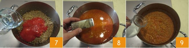 Add water 7 and let it cook for at least 2 hours: if the sauce dries out too much during cooking, add more water. However, it's important that the sauce is quite dry when the cooking is finished. Adjust the salt and pepper 8. When the sauce is about to finish cooking, add the milk 9 and continue stirring. Once the cooking is finished, turn off the heat and set aside.