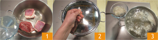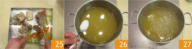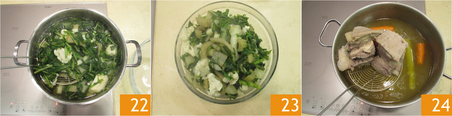 Drain the vegetables 22 and set them aside 23. Also, take the meat out of the broth 34, leaving the broth in the pot.