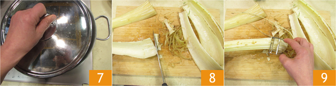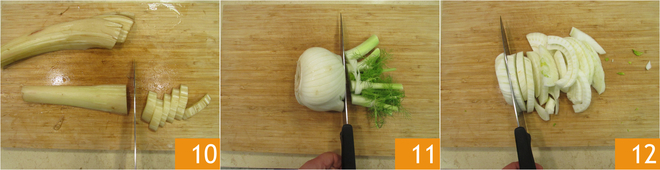 Slice the cardoons 10. Remove the green part of the fennel 11, then slice it 12.