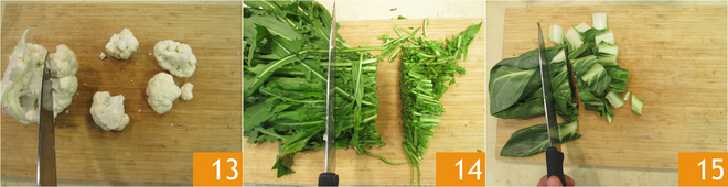 Cut out the cauliflower florets 13. Remove the ends of the chicory stalks 14, wash the leaves thoroughly by soaking them several times, frequently changing the water, and then drain well. Do the same with the stalks, removing the ends and cutting them into rough pieces 15.