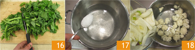 Proceed in the same way with the turnip tops: remove the stem ends, roughly chop them, and wash well by soaking, frequently changing the water, then drain well. In another pot with slightly salted boiling water, add the cauliflower and fennel 18.