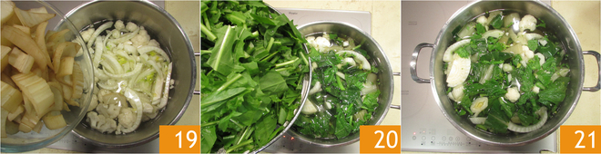 Add the cardoon 19, stalks (Swiss chard), and turnip tops. Let them cook for a couple of minutes, then add the chicory 21. Cook everything for at least 20 minutes 22.