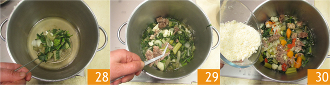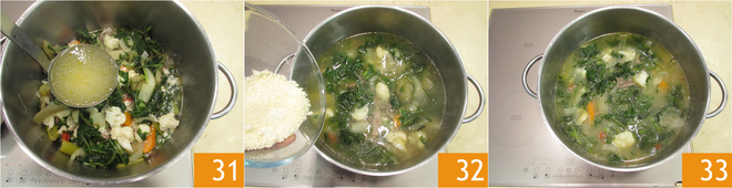 Continue like this until you run out of vegetables and meat, then cover everything with more broth 31 and finally more grated cheese 32. In the end, stir and let it cook for another 20 minutes altogether 33.