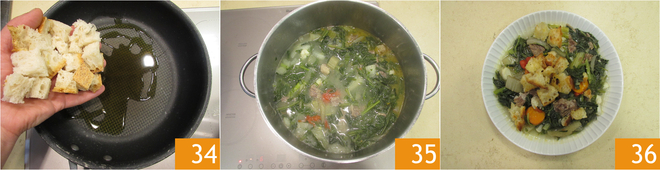 Prepare the bread croutons by heating a drizzle of oil in a pan. Toast the croutons until golden brown 34. The green soup is ready 35, serve it steaming hot with croutons 36!