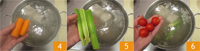 You can then add the peeled and roughly chopped carrot 4, celery stalks 5, and cherry tomatoes 6.