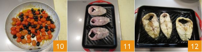 At this point, prepare the side dish by cutting half of the cherry tomatoes in half 4 and leaving the others whole. Pour 2 teaspoons of oil in a pan and add a clove of garlic in its skin, but slightly crushed 5. Let it brown and add both the cherry tomatoes and the black olives 6.