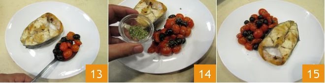 Serve your grilled gilthead bream fillets with the Mediterranean side dish 13, sprinkle with dried oregano 14, and serve them hot 15!