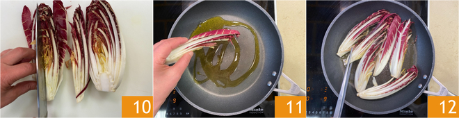 Set the sauce aside and focus on the radicchio: divide the heads into wedges about 1.25 inches thick 10. Heat the oil in a pan and place the radicchio 11, then brown on both sides over medium heat 12.