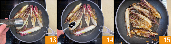 When it starts to crust, add salt, pepper 13, and balsamic vinegar 14; cook the radicchio for a total of about 5 minutes. Once cooked, set the radicchio aside 15.