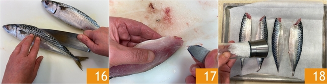 At this point, clean the mackerel: cut the fillets 16 and remove the bones 17, then salt them on both sides 18.