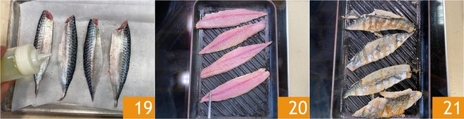 Also, drizzle with a little oil 19. Heat a grill well, then place the mackerel fillets skin side down. Cook for 4-5 minutes on each side 20, or until the flesh becomes opaque and flakes easily 21.