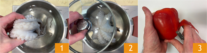 To prepare the grilled octopus, start by submerging the octopus in boiling water 1, cover with a lid 2, and let it cook for 40 minutes. Meanwhile, peel the pepper 3.