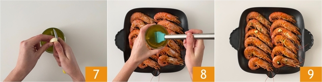 Add the garlic cut into pieces 7 and mix. Once cooked, salt the prawns. Use part of the dressing to brush the prawns 8, they will become shinier and more flavorful 9. Serve the grilled prawns with the remaining dressing.
