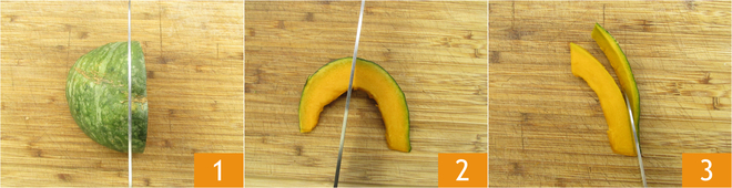 To prepare the Bruschetta with grilled pumpkin and robiola, start with the pumpkin: slice it into approximately 0.2-inch 1 pieces and remove the seeds, cut them in half 2 and peel them 3.