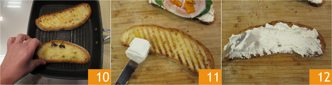Toast the bread on the grill until it is golden brown 10. Start assembling the bruschetta: spread a layer of approximately 1.5 oz of robiola 11 on each slice 12.