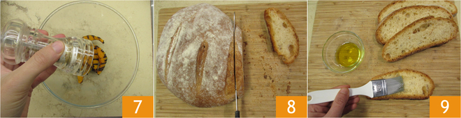 pepper, and salt 7, set it aside. Slice the bread 8 and brush it with olive oil 9.