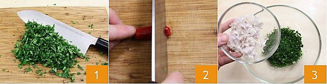 To prepare the grilled salmon with parsley sauce, start with the parsley sauce, which you can prepare a few hours in advance if you prefer. Finely chop with a knife (or mince in the blender) the parsley 1 and the shallot; cut the fresh chili pepper into small pieces 2. In a bowl, place the chopped parsley, the chopped shallot