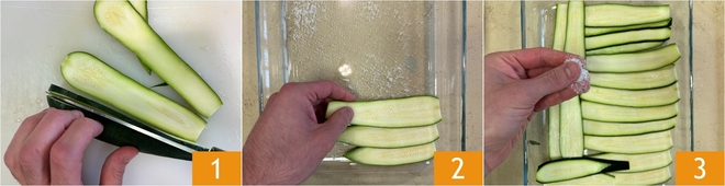 To prepare the grilled zucchini, first slice the zucchini to a thickness of about 1/4 inch with a mandolin, or with a knife 1. Put a pinch of salt at the bottom of a baking dish, place the zucchini slices on top 2, and lightly salt again 3. Cover and let marinate for about 30 minutes, so they lose their excess moisture.