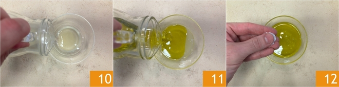 In the meantime, also prepare the vinaigrette. In a small bowl, pour the lemon juice 10, oil 11, chopped garlic clove, and a pinch of salt 12.