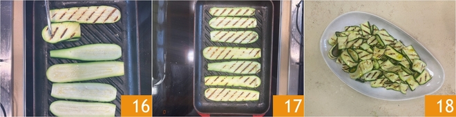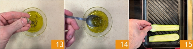 Add the oregano 13 and stir well to emulsify 14. Heat a grill pan, preferably cast iron, on the stove. Place the zucchini slices on top 15.