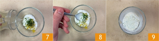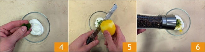 Meanwhile, prepare the yogurt sauce. In a small bowl, pour the yogurt, chopped chives 4, lemon zest 5, and a sprinkle of pepper 6.