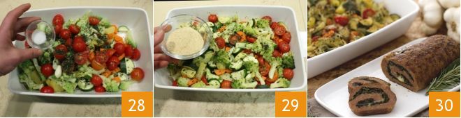 a clove of garlic, salt 28, ground pepper, and then cover them with a layer of breadcrumbs 29. Cook in a Samsung 3 oven using the automatic setting for single cooking A17 (roasted vegetables), at the end of the program, move the tray to the top shelf and turn on the grill for a few minutes to achieve a better browning 30. The dishes are ready: slice the ground meat roll and serve it with the roasted vegetable tray.