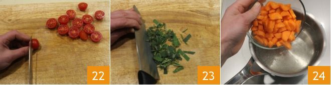 Finally, wash and halve the cherry tomatoes 22. Finely chop the aromatic herbs: rosemary, bay leaf, thyme, and sage 23. Blanch the carrots for a few minutes 34 and