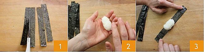 Wrap the nori seaweed around the rice ball 4 and spread some cooked rice grains along the upper edge of the seaweed 5, then secure the edges well 6.