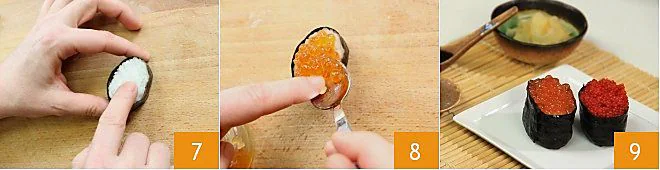 Flatten the rice ball 7 and fill the empty space created with a couple of tablespoons of fish eggs 8 or ingredients of your choice cut like a tartare. Your gunkanmaki are ready 9.