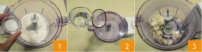 First, make the dough for the gyoza cacio e pepe wrappers. Pour the flour and salt into a mixer with blades 1. Start the blades and gradually pour in the hot water into the machine 2. Continue to mix until the dough is well combined 3.