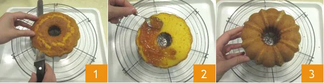 Once the cakes have cooled, place the first one with the bottom facing down on a wire rack placed on a tray, and with a flat, smooth knife cut off the top of the cake to level it 1. Perform the same operation for the other cake. Spread the jam on the cut part of the first cake 2 and cover with the second 3.